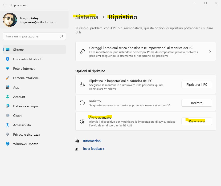 In Windows 11, apri Impostazioni > Sistema > Ripristino > Avvio avanzato e fai clic su Riavvia ora