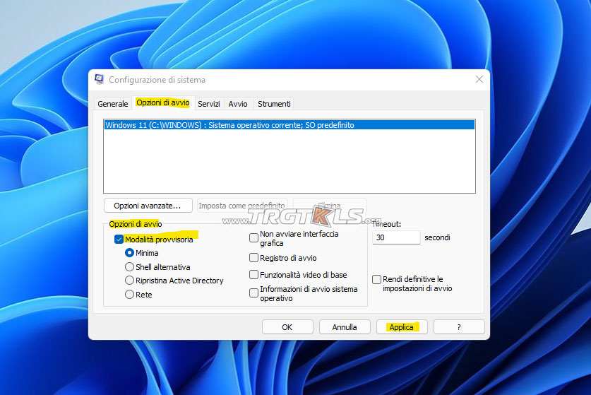 Nella scheda Opzioni di Avvio, seleziona le opzioni Avvio sicuro e scegli Minimo. Clic su Applica/OK ed uscire. Al riavvio, il computer entrerà direttamente in modalità provvisoria.