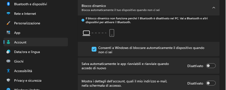 Se non sei abituato a bloccare il tuo sistema, puoi utilizzare la funzione Blocco dinamico per bloccare automaticamente il sistema. A volte può capitare anche di dimenticare di bloccare il sistema quando si sposta, se hai dei file o lavori importanti che magari tuo figlio in quel momento non dovrebbe toccare il computer, Il blocco dinamico entra in gioco proprio in quel momento, se ti allontani dal tuo pc si bloccherà in automatico.