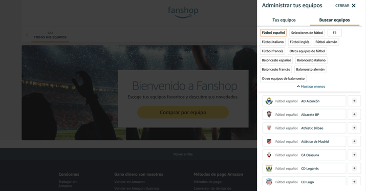 Scorrendo fino alla fine del menu a discesa, troverai l'accesso a tutte le squadre con merce disponibile su Amazon. Da lì puoi facilmente sfogliare e selezionare i prodotti desiderati.
