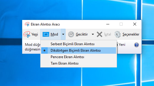 Bir diğer yöntem “Ekran Alıntısı Aracı”nı kullanmak. Programı bulmak için arama çubuğuna “Erkan Alıntısı Aracı” yazabilirsiniz. Programı açıktan sonra “Yeni” seçeneğini tercih ederek kaydetmek istediğiniz alanı düzenleyip kaydedebilirsiniz.