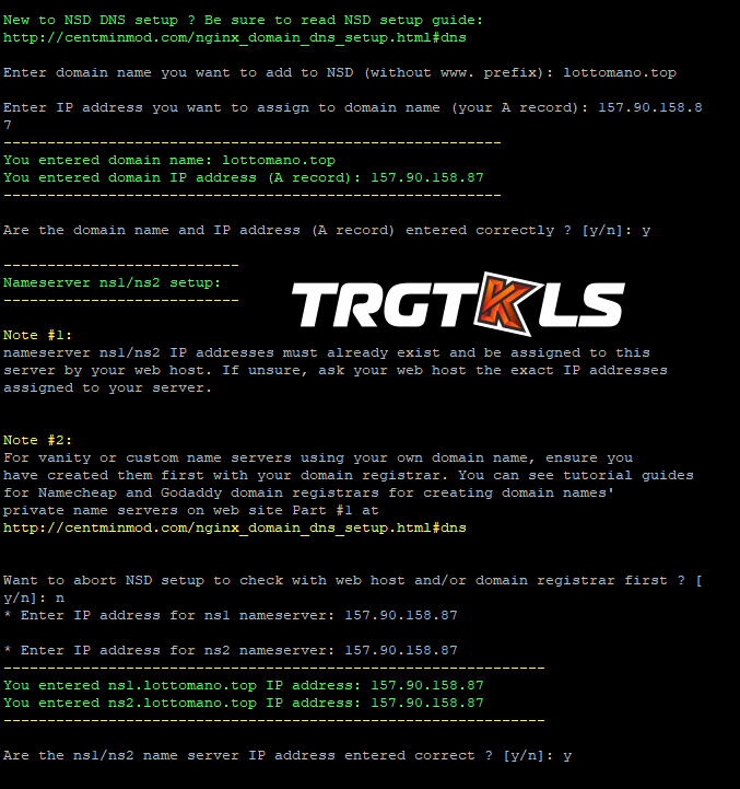 al termine dell'installazione NSD, sarà possibile iniziare la configurazione, quindi digita "3" per iniziare ad usare i tuoi name server. Avviato la configurazione Centmin chiederà di inserire l'indirizzo IP per qui assegnerà ai nostri name server. Per Default i nameserver vengono eseguiti come ns1.nomesito.ltd/ns2.nomesito.ltd.