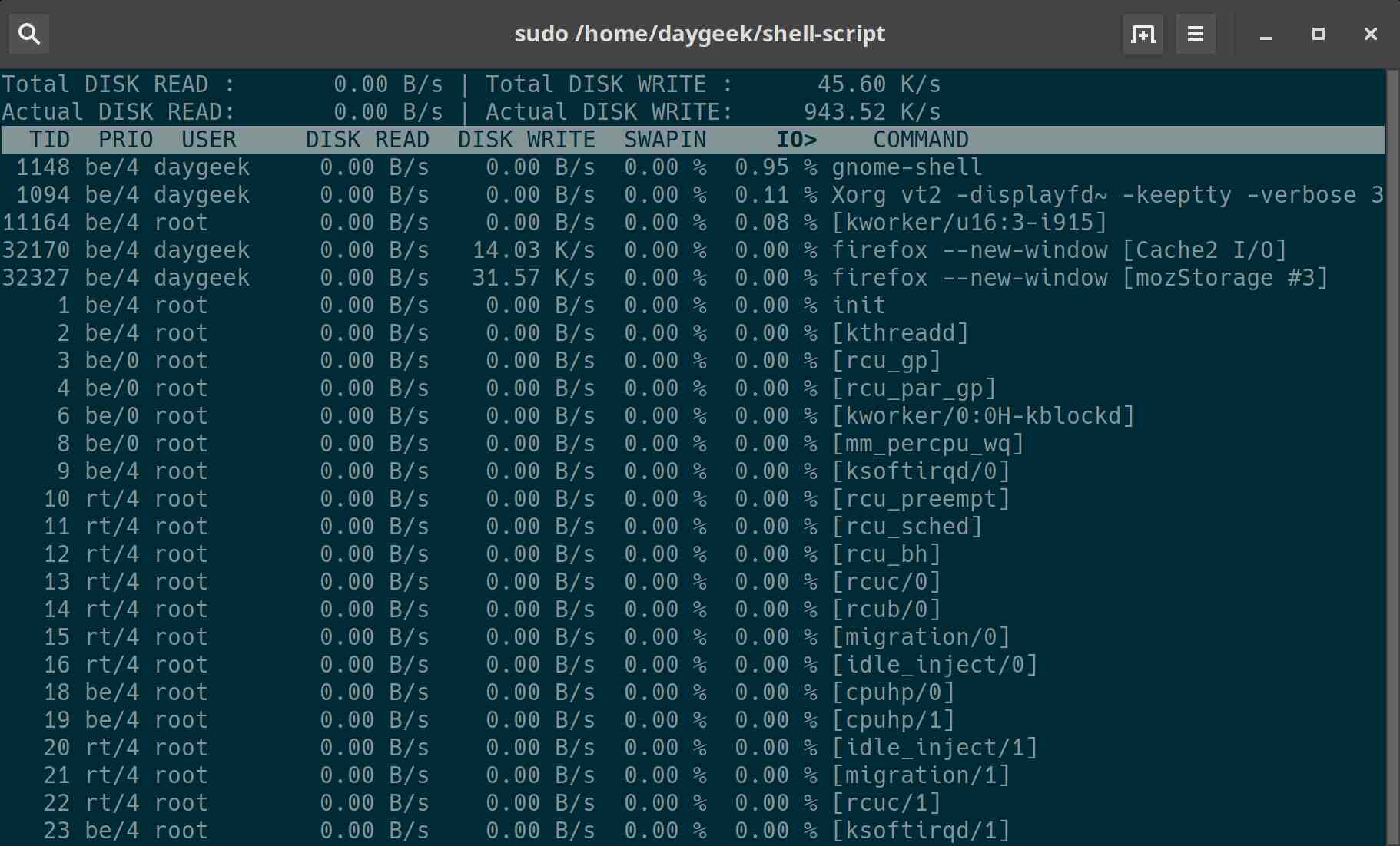 iotop osserva le informazioni sull'utilizzo di I/O dal kernel Linux e visualizza una tabella dell'utilizzo corrente di I/O attraverso processi o thread nel sistema.