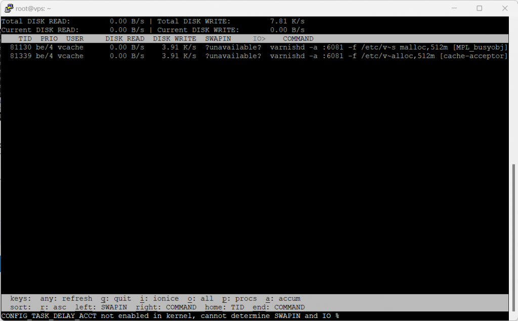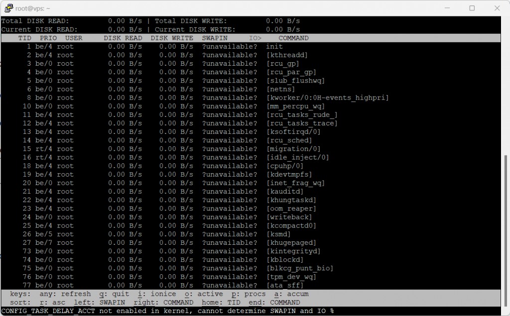 IO:Mostra l'utilizzo di input/output di ciascun processo, inclusi disco e swap.SWAPIN:Mostra solo l'utilizzo dello swap di ciascun processo.