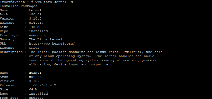 Per controllare i parametri di sistema come la versione del kernel e la data di compilazione, l'architettura del sistema operativo, il nome host, ecc., è possibile utilizzare il comando yum info kernel -q