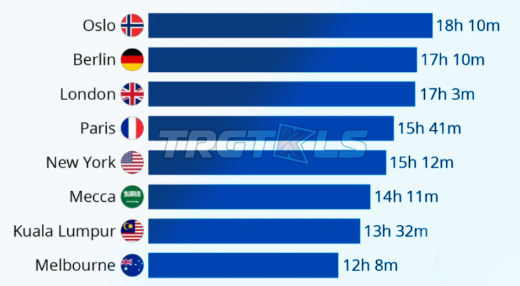 Mentre un musulmano che vive a Oslo, la capitale e la città più grande della Norvegia, deve digiunare per circa 18 ore e 10 minuti; Chi vive a Melbourne, in Australia, la città più meridionale del mondo con una popolazione di oltre 1 milione di abitanti, digiunerà per circa 12 ore e 8 minuti.
