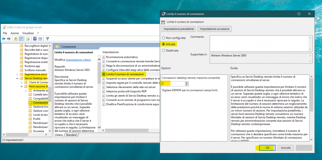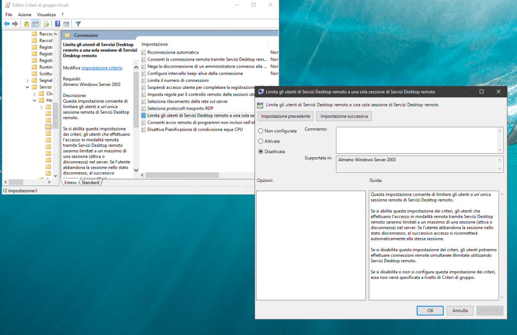 Puoi seguire con la stessa procedura per disabilitare sessioni multipli. Ora puoi connetterti al tuo rdp.