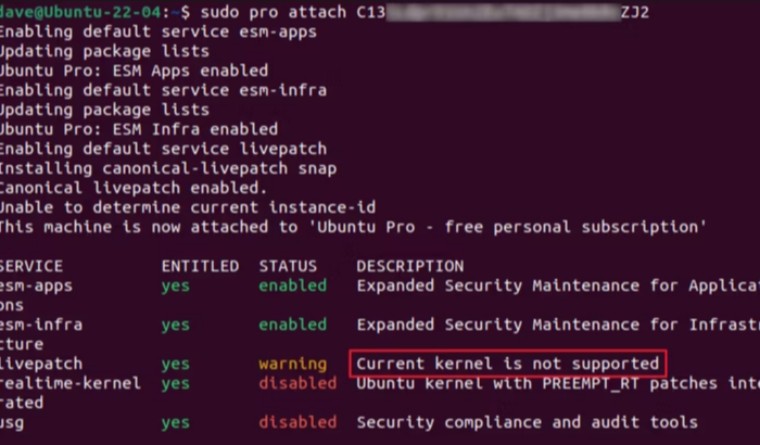 Noterai che nello screenshot c'è un messaggio che dice "Il kernel corrente non è supportato" per l'applicazione di patch live. Attualmente, le patch live funzionano sulla versione del kernel rilasciata con ciascuna versione LTS di Ubuntu. I kernel di abilitazione hardware sono kernel che sono stati aggiornati per supportare l'hardware che non era disponibile al momento del rilascio di LTS.
