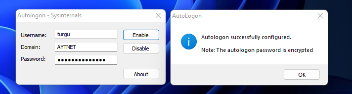 La funzione "Accesso automatico" di Windows Sysinternals consente di configurare facilmente il meccanismo di accesso automatico integrato di Windows. Invece di attendere che un utente inserisca il proprio nome e password, Windows utilizza le credenziali immesse con Autologon, che è crittografato nel registro, per accedere automaticamente all'utente specificato.