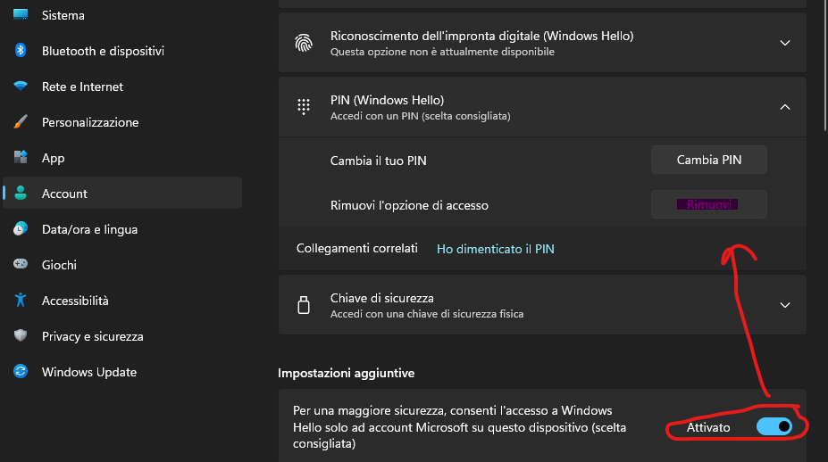 Se non ti è possibile disattivare e perchè hai ancora attivo la protezione di Windows Hello, disabilita questa funzione nel cerchio di sopra raffigurato. Disabilitando l'opzione Per una maggiore sicurezza, consenti l'accesso a Windows Hello solo per gli account Microsoft su questo dispositivo (consigliato) dopo sarà possibile rimuovere il pin.
