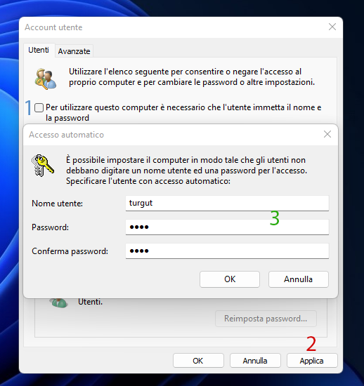 Una nuova finestra chiamata "Accesso automatico" ti chiederà di inserire un nome utente e una password. Immettere il nome utente e la password utilizzati per accedere a Windows. Windows utilizzerà queste credenziali di accesso salvate per accedere automaticamente a Windows all'avvio, senza dover inserire nuovamente nome utente e password manualmente. Fare clic su OK per salvare le modifiche. Riavvia il PC e verifica se Windows accede automaticamente allo schermo del desktop senza alcuna azione da parte tua.