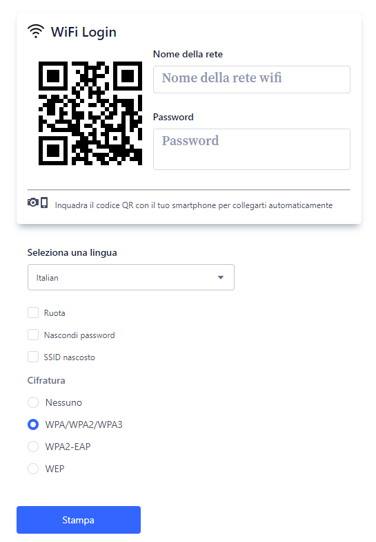 Digita il nome SSID della tua rete, per poi digitale la password per poi cliccare su stampa per avviare la creazione del QR code da applicare nella tua vetrinetta.