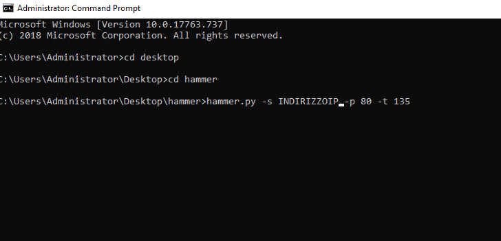 Ora avvia CMD con i previlegi, e passa al desktop con il comando: (dipende da dove sono collocati i file) nel mio caso desktop>hammer (cioè una cartella apparte)
