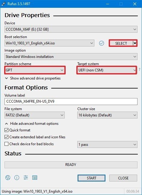 - Masterizza il file ISO di Windows 10 sulla chiavetta USB dicendo "START". Tutte le informazioni in memoria verranno formattate.