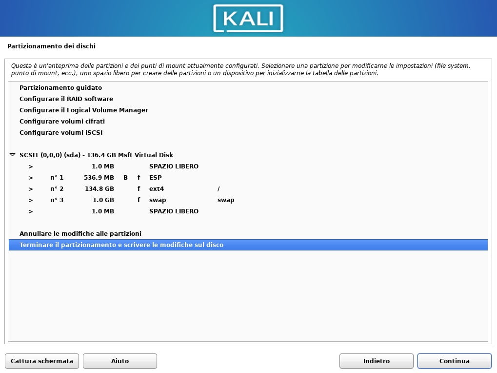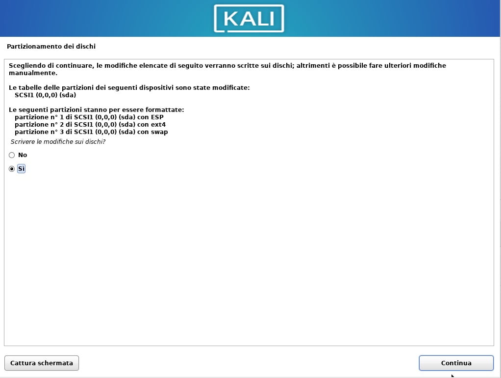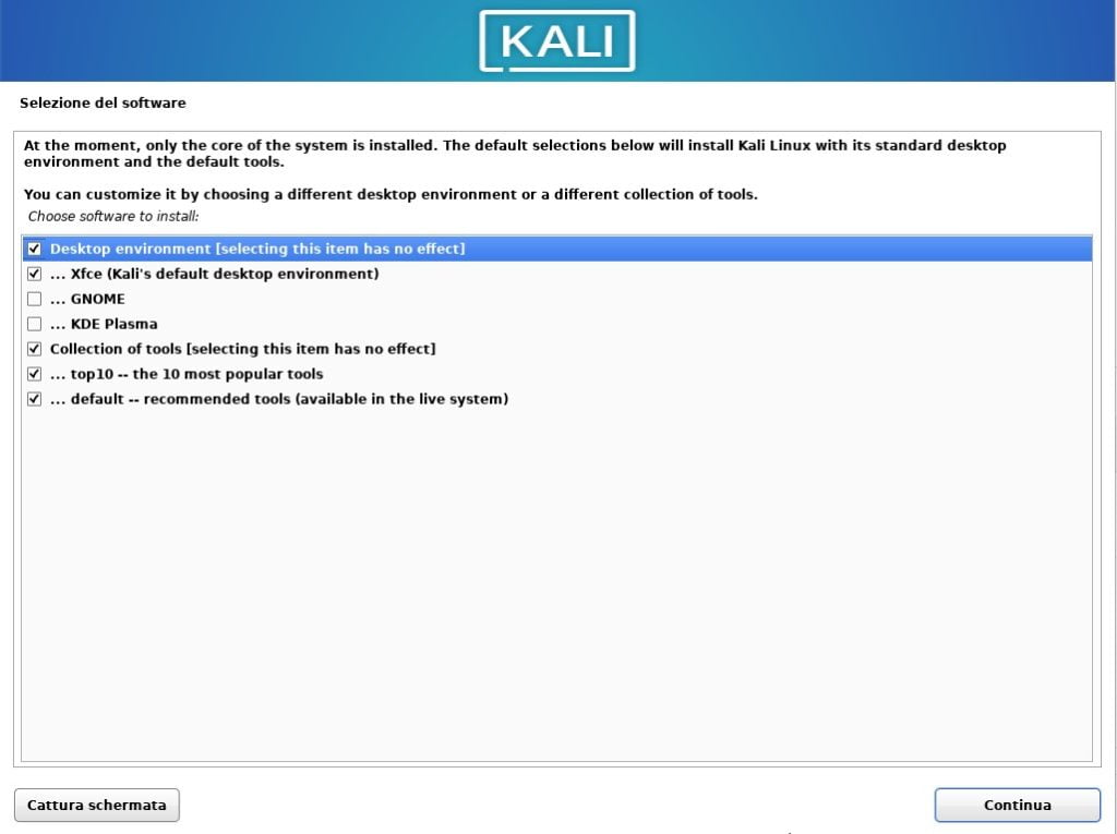 Scegli le applicazioni software e l'ambiente desktop Kali da installare.