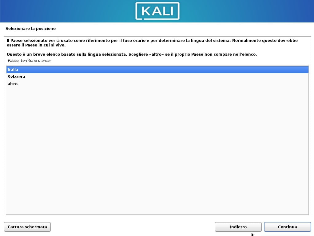 Selezionare un paese per il fuso orario corretto da impostare per la macchina durante l'installazione.