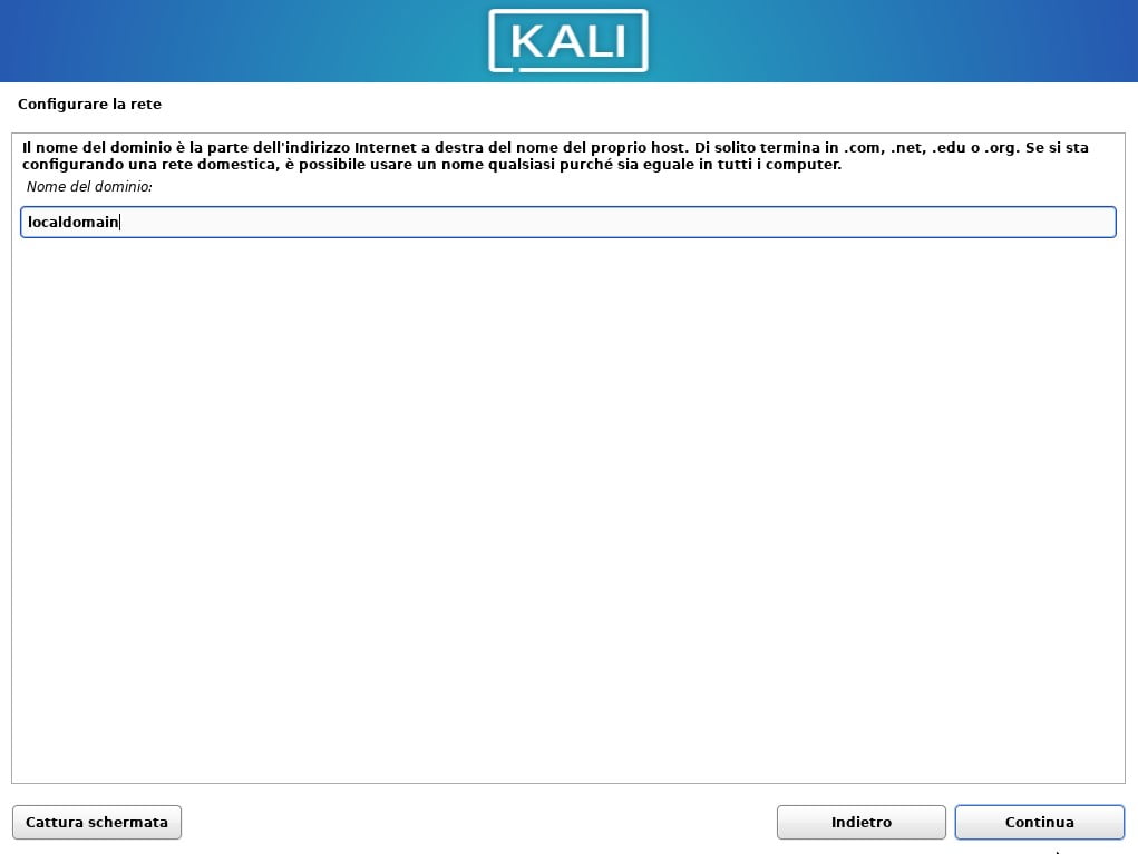 Imposta il nome di dominio, questo farà parte dell'FQDN – <nome_host>.<nome_dominio> oppure utilizza localdomain.