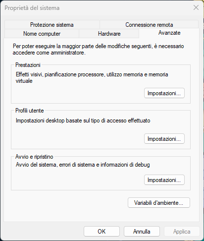 Nella finestra Proprietà di sistema avanzate fare clic su Impostazioni nella sezione Prestazioni.
