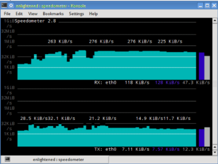 Il speedometer mostra un grafico pulito e chiaro che mostra il traffico di rete Linux che scorre in entrata e in uscita attraverso tutte le interfacce di rete del sistema.