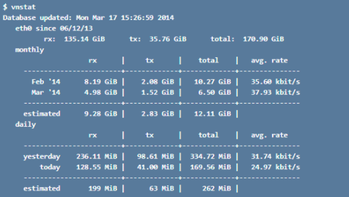 Se non fornisci alcuna opzione per eseguire il comando vnstat, verranno visualizzati tutti i dati trasferiti dall'avvio del demone.