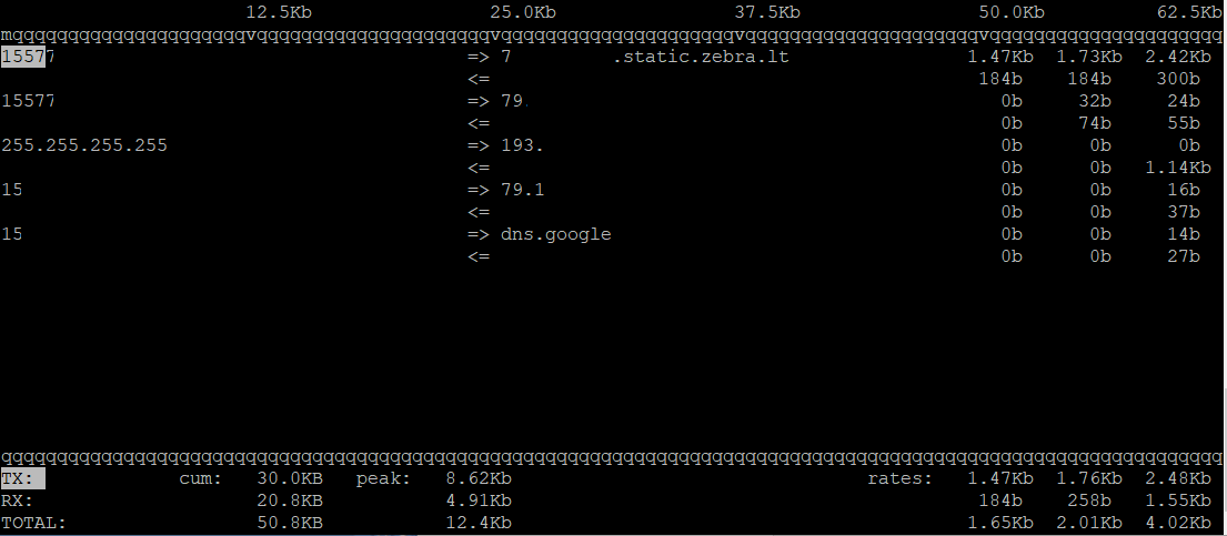 Questo strumento funziona quasi come lo strumento Nload che visualizza il carico del traffico all'interno dell'interfaccia di rete del sistema. L'uscita del cavolo mostra il grafico fornito con i dettagli del traffico a livello di pacchetto.