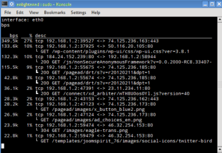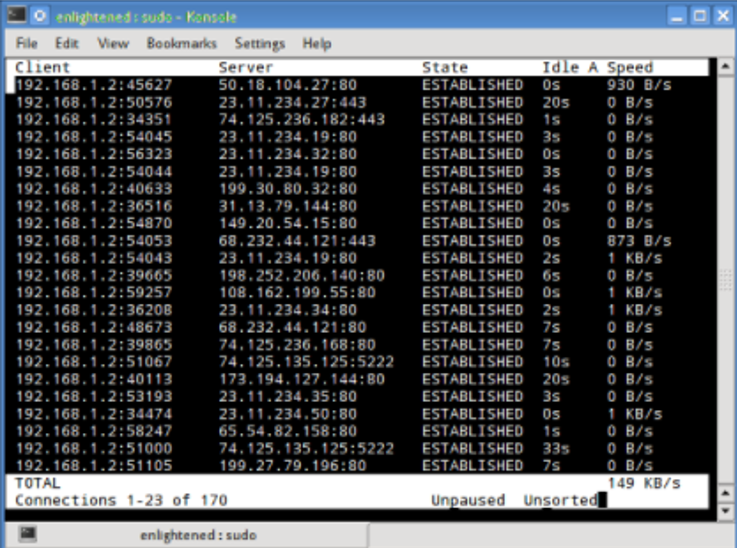 Visualizza le connessioni in tempo reale e attive e la velocità con cui fluiscono i dati. Specifica quale tipo di connessione viene utilizzata per il trasferimento dei dati. Utilizza i comandi seguenti per eseguire l'installazione su distribuzioni Ubuntu o Debian.