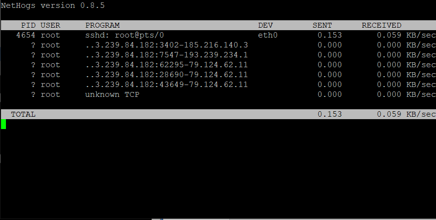 Permette di misurare il flusso di dati attraverso le connessioni socket. Funziona in modo leggermente diverso da nload. iftop viene fornito con la libreria pcap che cattura il movimento dei pacchetti per trovare la larghezza di banda utilizzata totale e consente di segnalare la larghezza di banda di una singola connessione senza menzionare il processo all'interno di quella connessione. iftop ti consentirà di filtrare l'utilizzo del traffico all'interno delle connessioni selezionate.