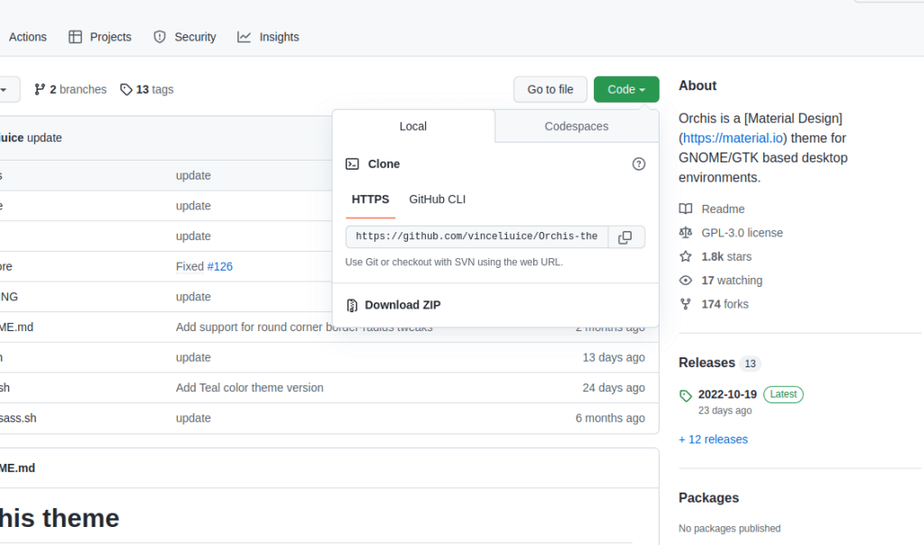 Per installare Orchis e necessario scaricare il file da github. Sulla pagina di githb clicca su Get Code e clicca su Download ZIP.