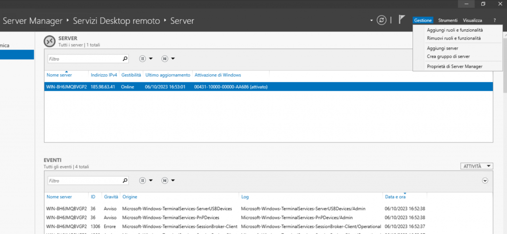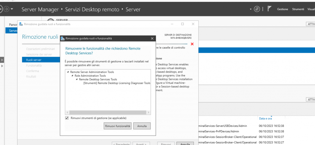 - Fare clic su Gestisci > Rimuovi ruoli e funzionalità per avviare la Rimozione guidata ruoli e funzionalità.