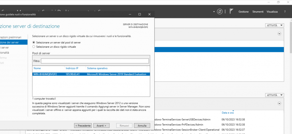 - Successivamente, nella pagina Seleziona server di destinazione, seleziona il server da cui desideri rimuovere ruoli e funzionalità.