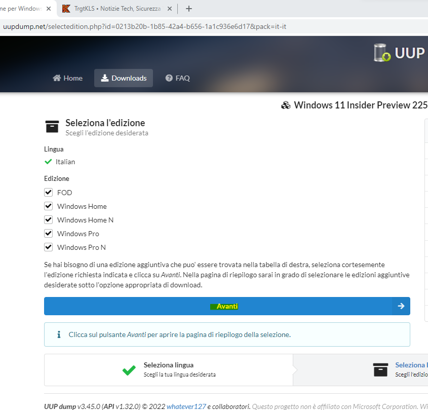 Seleziona le edizioni che desideri scaricare oppure lascia selezionati tutti e clicca avanti.
