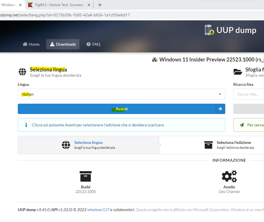 Dato che Microsoft pubblica raramente immagini ISO pubbliche delle versioni italiane interne del sistema operativo Windows 11 e Windows 10, sarà importante considerare un modo aggiuntivo per ottenere immagini ISO di Windows 11 e Windows 10. UUP Dump è il modo più pratico e semplice per ottenere immagini ISO di qualsiasi versione di un programma insider di Windows 10 o Windows 11 anche nella lingua italiana. UUP Dump crea un file di configurazione di avvio in base alla tua scelta, scarica i file necessari direttamente dai server Microsoft e infine crea un'immagine ISO alla base della lingua selezionata.