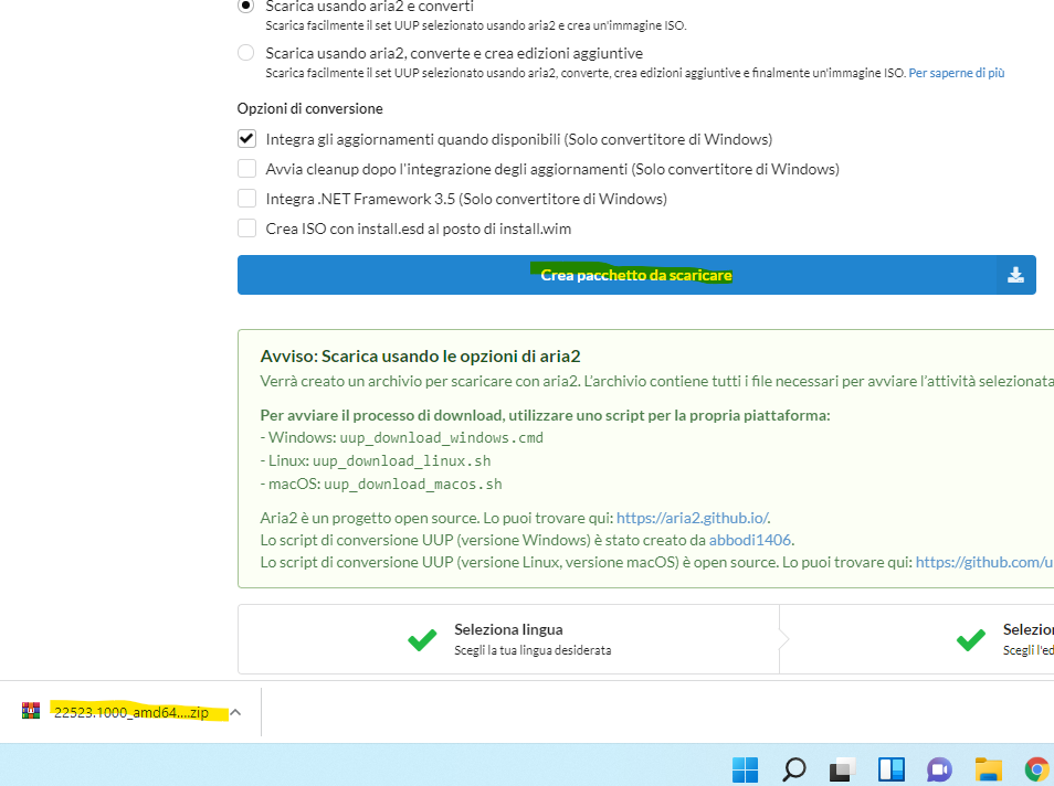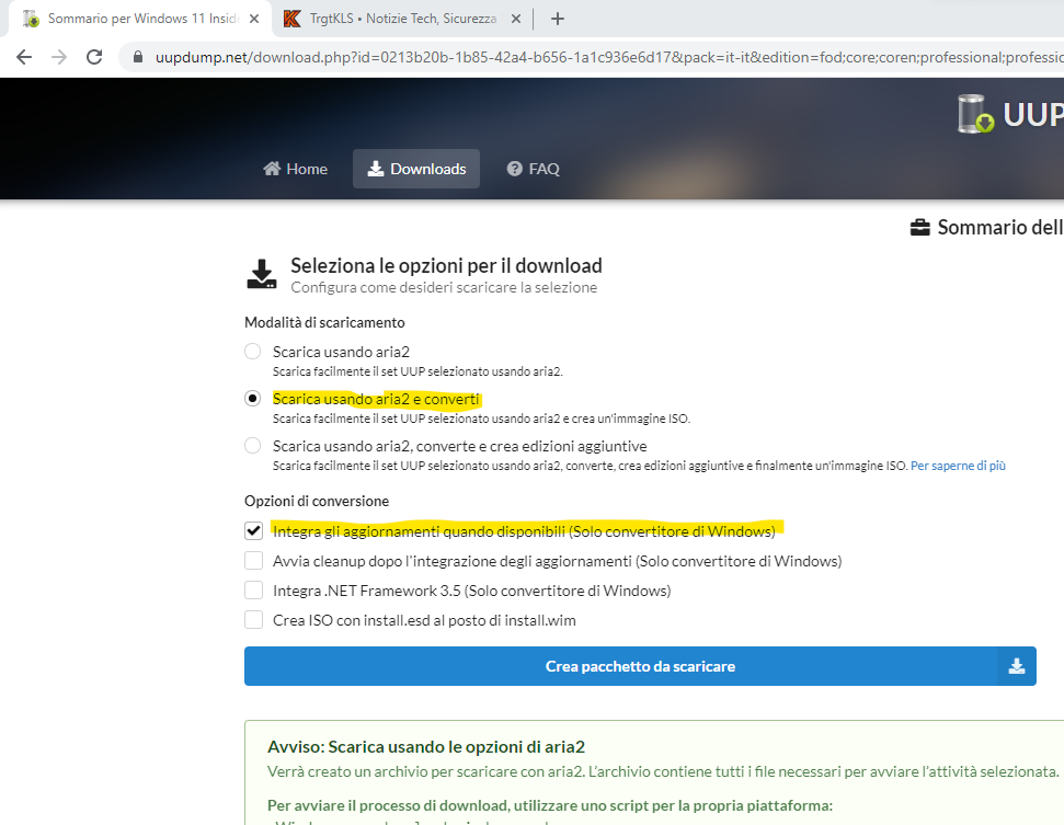 Nella finestra successiva, lascia le impostazioni predefinite, ovvero Scarica e converti in ISO e Includi aggiornamenti (solo conversione di Windows). Fare clic sul pulsante Crea pacchetto da scaricare.