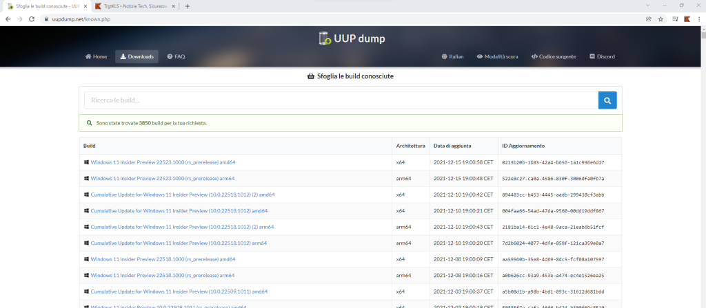 Dunque, vai al sito UUP Dump dove potrai trovare qualsiasi release che Microsoft rilascia ad ogni aggiornamento. Vai al menù Download per trovare le Build rilasciate di recente.