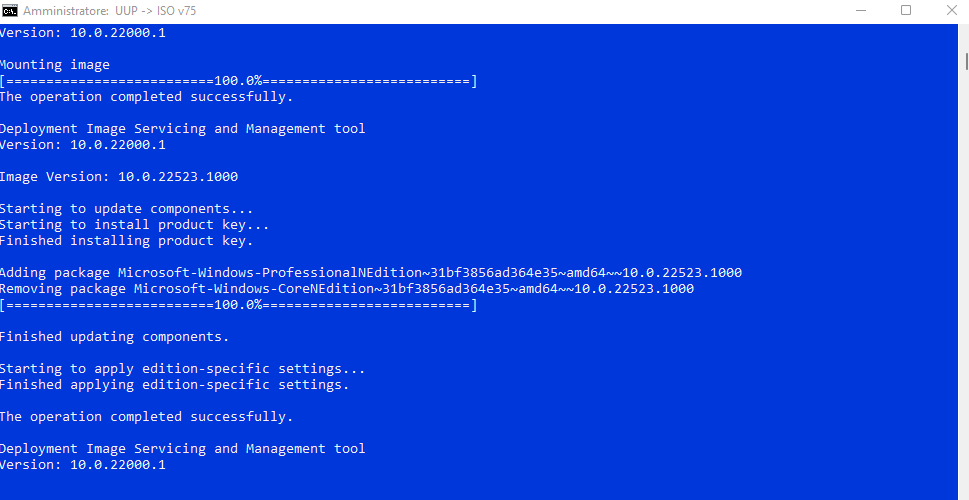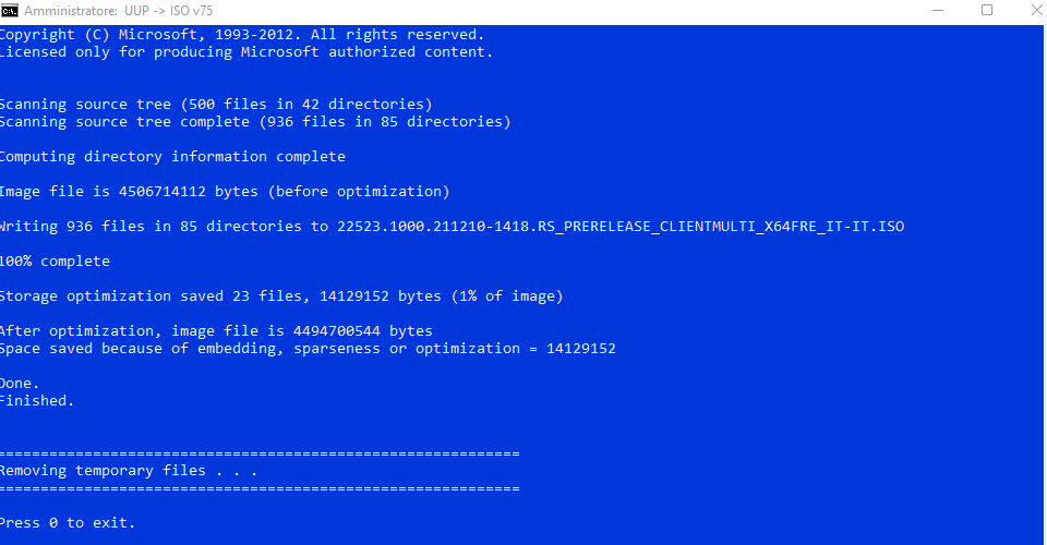 Al termine del download dei file UUP, lo script inizierà a creare l'immagine ISO. Un segno che il download è terminato e l'immagine ISO ha iniziato a essere creata potete anche notare dal cambiamento del colore di sfondo dal nero al blu. Quando il processo di creazione dell'immagine è completo e viene richiesto di chiudere la riga di comando, premere 0 per chiuderla.