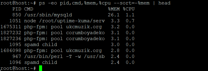 ps -eo pid,cmd,%mem,%cpu --sort=-%mem | head