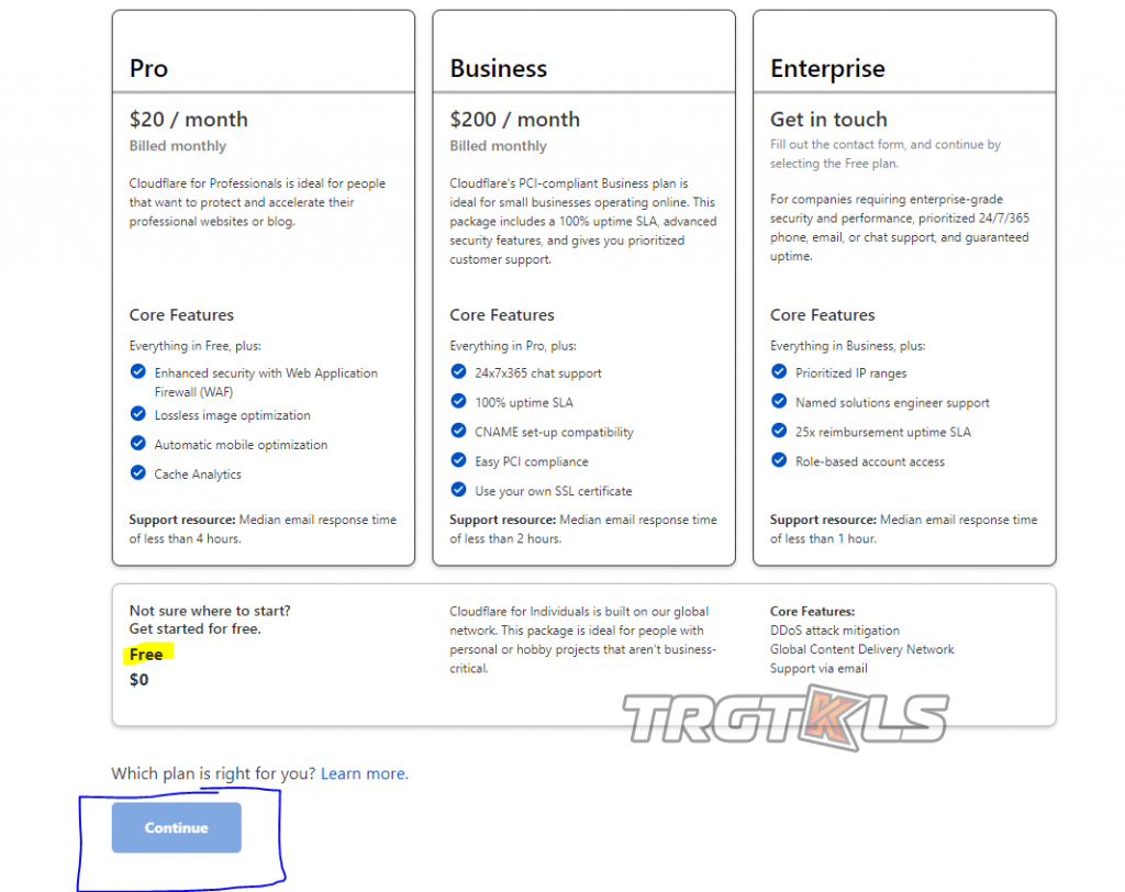 Proseguendo comparirà i piani e prezzi del servizio in abbonamento a cloudfare, noi proseguiremo in maniera Free quindi scegliete Free e proseguite.