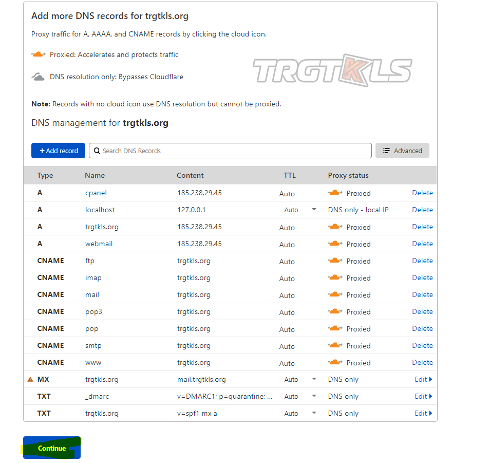 In questo passaggio, creerà una struttura secondo se stessa interrogando le impostazioni DNS in cui è attivo il tuo nome di dominio. Qui puoi modificare se vuoi aggiornare. Se non è presente alcuna regolazione, fare clic sul pulsante Continua nella parte inferiore della pagina.