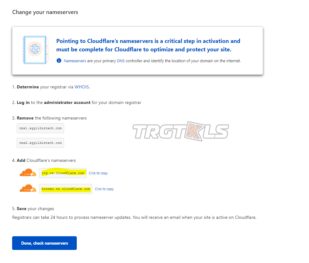 Come ultimo passaggio dell'installazione di Cloudflare, è necessario utilizzare gli indirizzi del server dei nomi che ha creato appositamente per te. È necessario aggiornare gli indirizzi del server nome di dominio attuali con gli indirizzi del server specificati da cloudfare.