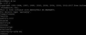 Bc sta per calcolatrice di base. Supporta numeri di precisione arbitrari con l'esecuzione interattiva di istruzioni. Ha alcune somiglianze nella sintassi del linguaggio di programmazione C. Se non riesci a trovarlo installato sul tuo sistema Debian / Ubuntu, puoi utilizzare il seguente comando per installare bc aprendo un terminale (Ctrl + Alt + T) e digitandolo: sudo apt install bc.
