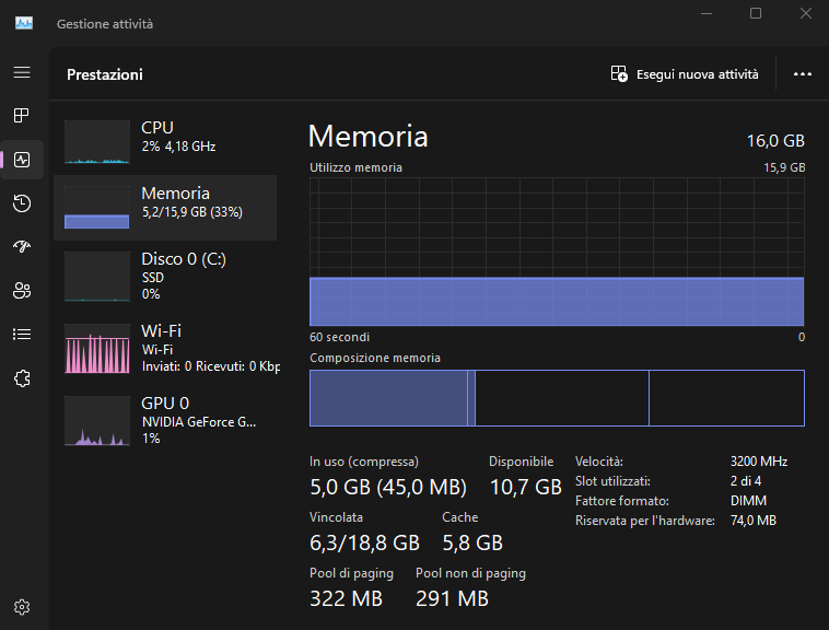 La scheda Prestazioni nella pagina Task Manager contiene molte informazioni dettagliate. Puoi vedere le prestazioni di CPU, memoria, SSD, Wi-Fi e GPU. È anche possibile conoscere lo spazio RAM disponibile, lo spazio utilizzato, la velocità, gli slot utilizzati, il fattore di forma e lo spazio allocato dall’hardware nell’intestazione della memoria. In altre parole, Task Manager è la pagina in cui puoi ottenere le informazioni più dettagliate sul tuo hardware.