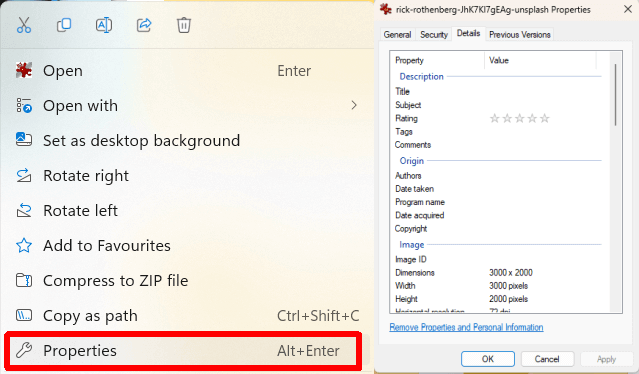 I metadati di un'immagine, noti anche come dati EXIF, sono informazioni incorporate su quell'immagine a cui puoi accedere facilmente per vedere se c'è qualche indizio su chi l'ha creata. Tieni presente che non troverai sempre i dettagli sul creatore di un'immagine o le informazioni sul copyright nei metadati, ma vale sempre la pena controllarli.