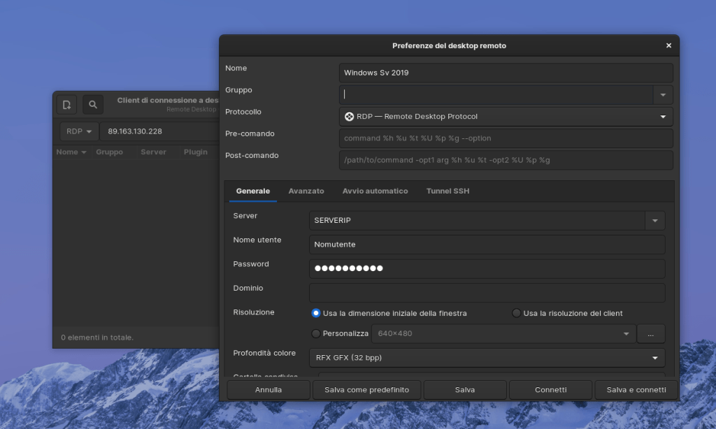 Quando utilizzi un software desktop remoto, tutte le operazioni che esegui si svolgono sul desktop remoto e ne utilizzano le risorse: Remmina (o un software simile) è solo un modo per interagire con quel desktop. Cerca nel menu start il programma Remmina e avvia subito la tua connessione remota. Possibile scegliere tra l'utilizzo di un client Desktop remoto ( rdesktop ) o FreeRDP ( xfreerdp ), l'implementazione open source del Remote Desktop Protocol (RDP), rilasciato con licenza Apache.