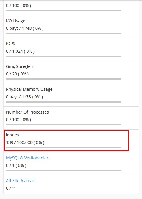 Inode (nodo indice) contiene metadati (struttura del file, dimensione del file, ecc.). Il limite di İnode contiene informazioni sulla struttura dei dati presenti nel sistema operativo Linux. Il numero di inode si riferisce al numero di file nel tuo account. In altre parole, ogni file (e-mail, immagine ecc.) Nel tuo account di hosting significa un inode. Il totale di tutti i file nel tuo account costituisce il numero di İnode.