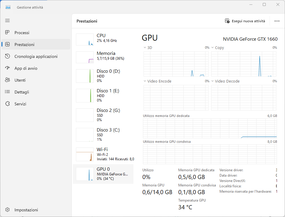 Come puoi vedere nell’immagine qui sotto, il mio PC ha una Nvidia GTX 1660 con 6 GB di VRAM (memoria GPU dedicata) e poiché ho 16 GB di RAM di sistema, 8 di questi sono allocati per essere utilizzati per la “Memoria GPU condivisa” (metà della RAM del mio sistema).