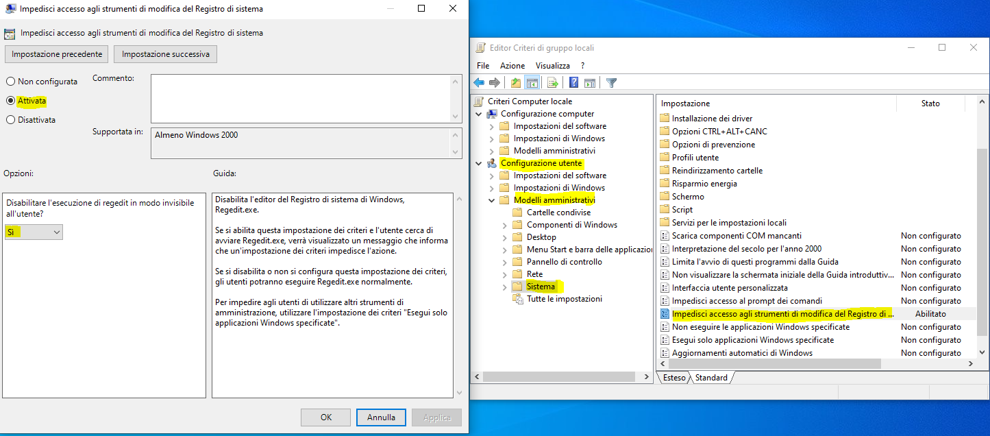 Avviato gpedit.msc segui: Configurazione Utente>Modelli Amministrativi>Sistema nel menu a sinistra cliccare "impedisci accesso agli strumenti di modifica del Registro di Sistema"