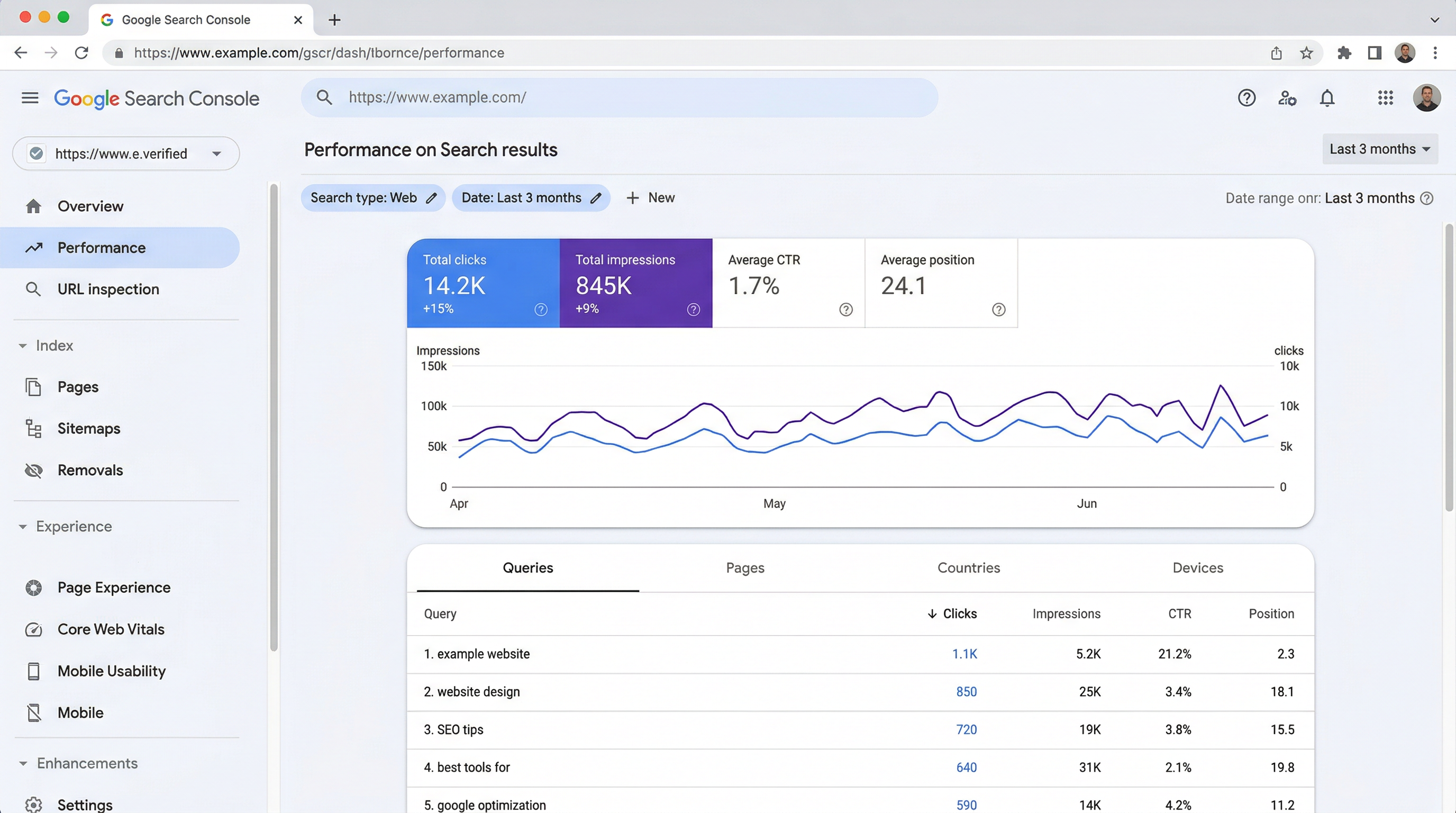 wwwe con lo schema giustohttps. - Rimuovi tutti i filtri del report. In Prestazioni e negli altri report, azzera query, pagina, paese, dispositivo e tipo di ricerca. Poi ricarica il report. Questa è la correzione più reversibile e spesso risolve il caso in pochi secondi.
