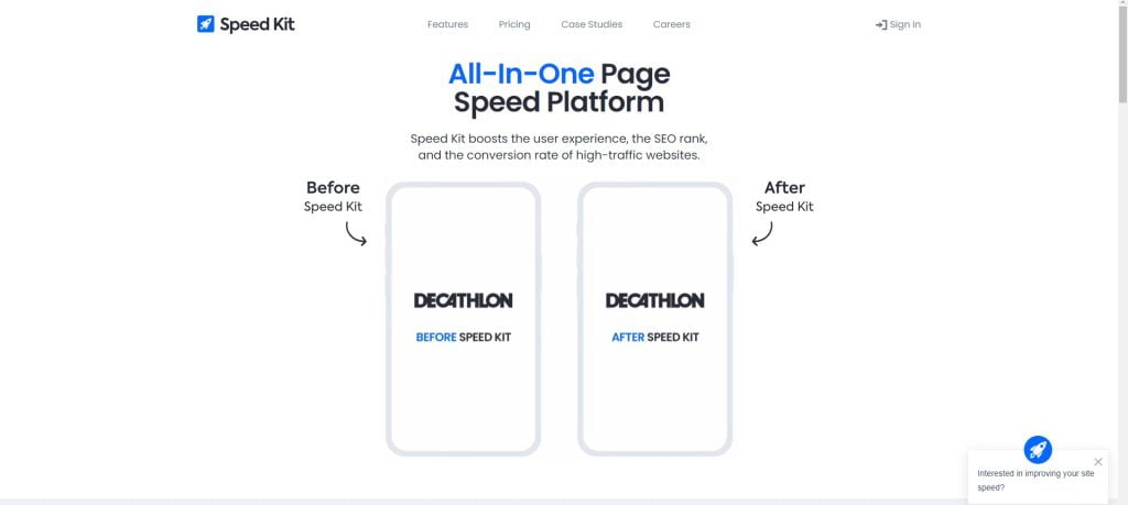 Speed Kit è lo strumento all-in-one per la velocità delle pagine per i siti Web ad alto traffico. Semplice integrazione tramite browser. Zero modifiche alla tua infrastruttura. Potenzia il tuo sito Web in 1 settimana e ottieni valore istantaneo per la tua attività. Trasforma la velocità della pagina nel tuo vantaggio competitivo.