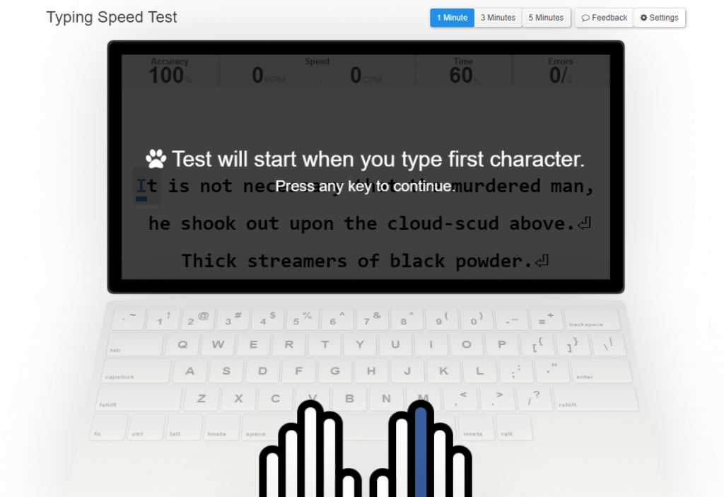 La cosa migliore di questo sito web è che puoi impostare un massimo di 5 minuti per testare la tua velocità di digitazione. Mostra le frasi originali in modo che tu possa iniziare a digitare rapidamente. Parlando delle informazioni, il sito web ufficiale di TypingCat mostra il livello di precisione, il conteggio delle parole / minuto, il conteggio dei caratteri / minuto, il tasso di errore, ecc.