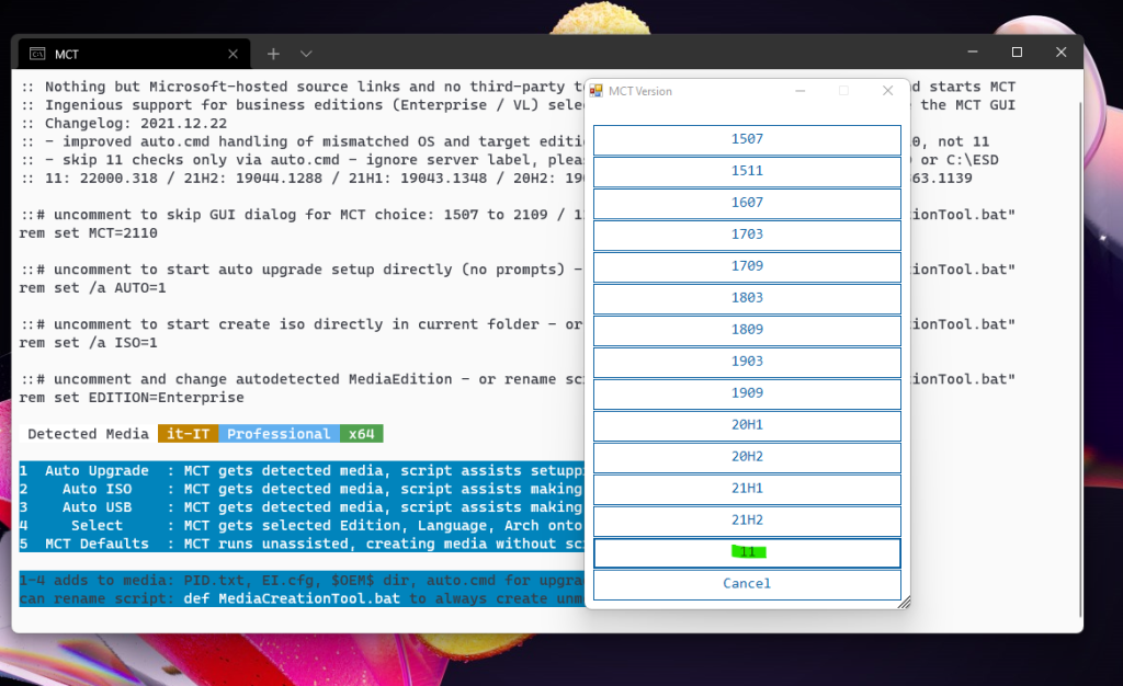 Questo fa parte del suo wrapper Universal MediaCreationTool (MCT), che ha creato molto tempo fa per aggirare i requisiti hardware minimi e i controlli TPM.